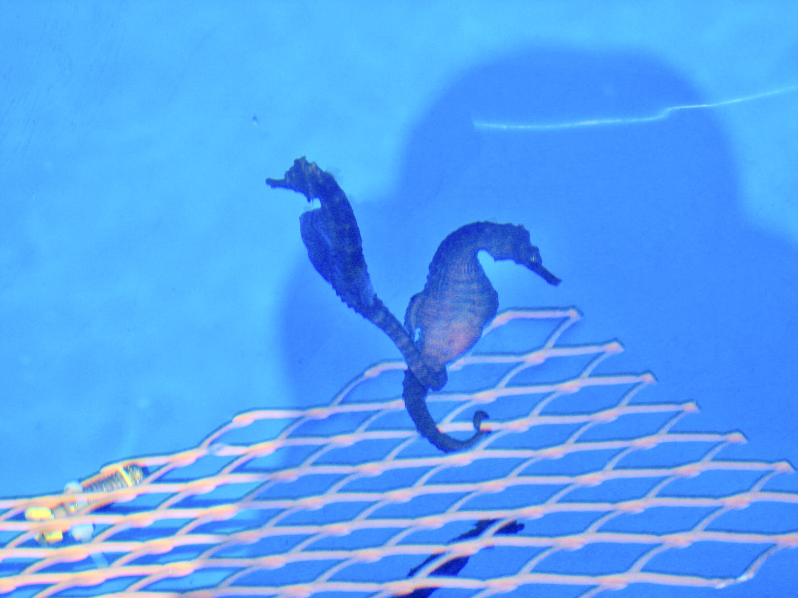 I am looking at one seahorse in particular. I can’t see the tiny, propelling fin on its back nor the two steering ones on each side. Its head tilts up and down, but the eyes are too small for me to notice that they swivel individually. I then follow instructions on how to put my hands in the seawater vat and wait. Surely enough, a nosy one checks me out and wraps its prehensile tail around my index finger with a tickling pressure.