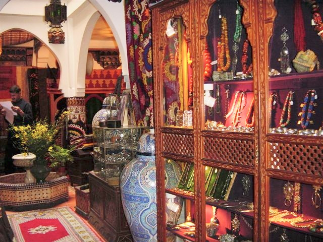 We leave the grayness of Tangier’s bustling medina at 66, rue Les Almouhads. Here, the open, massive front door no longer repels assailants. It invites antique ware hunters instead. Boutique Majid owner welcomes us by a trickling fountain. We immediately fall under the charm of a vivid ensemble of colors, textures, and shapes, all from generations past. Textiles, wood trunks, clothing, ceramics, glass lanterns, and carpets compete for our attention. My friend is on a mission to buy fabric, and I have fallen under the spell of the jewelry.
