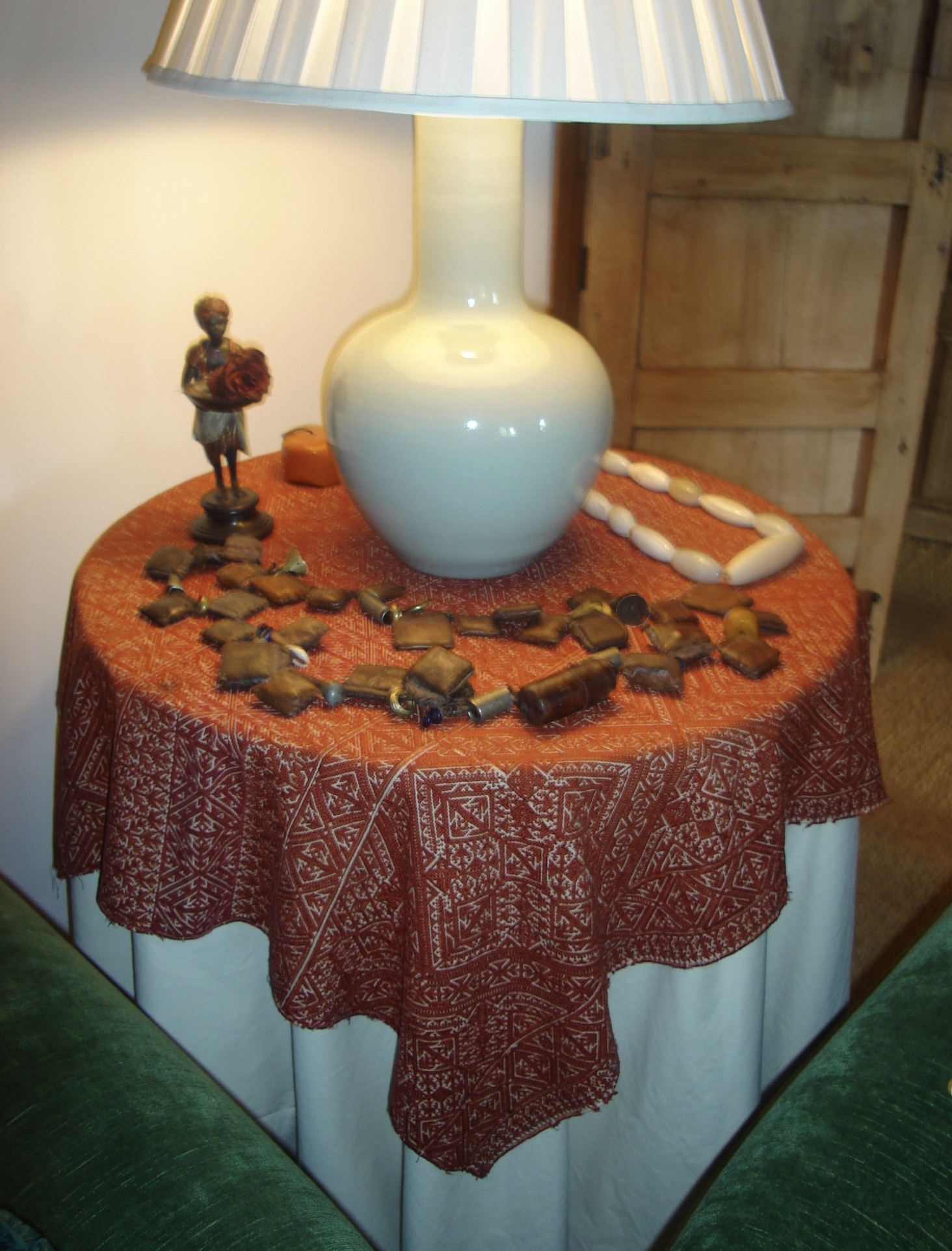 As an antique dealer, Majid travels throughout Morocco to find the precious fabrics and other items he sells. He restores value to small remnants of cloth abandoned in old family trunks, assembling them patchwork-style into tabletops, throws, or unique purses. All incoming pieces are cleaned and classified according to size, condition, origin, color, and value.