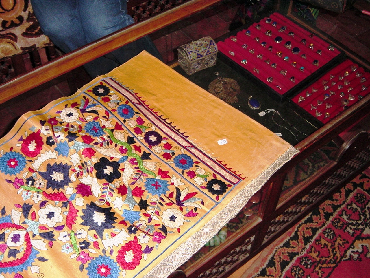 “How much?” my friend asks. Majid leads us back downstairs as he holds the precious one-by-three-quarter yard piece. A teapot of fragrant mint tea and colorful glasses await to soothe the price tag: $800. I sip the sweet potion while gazing at the necklace that caught my fancy. There is no negotiating; the past has a fixed price.