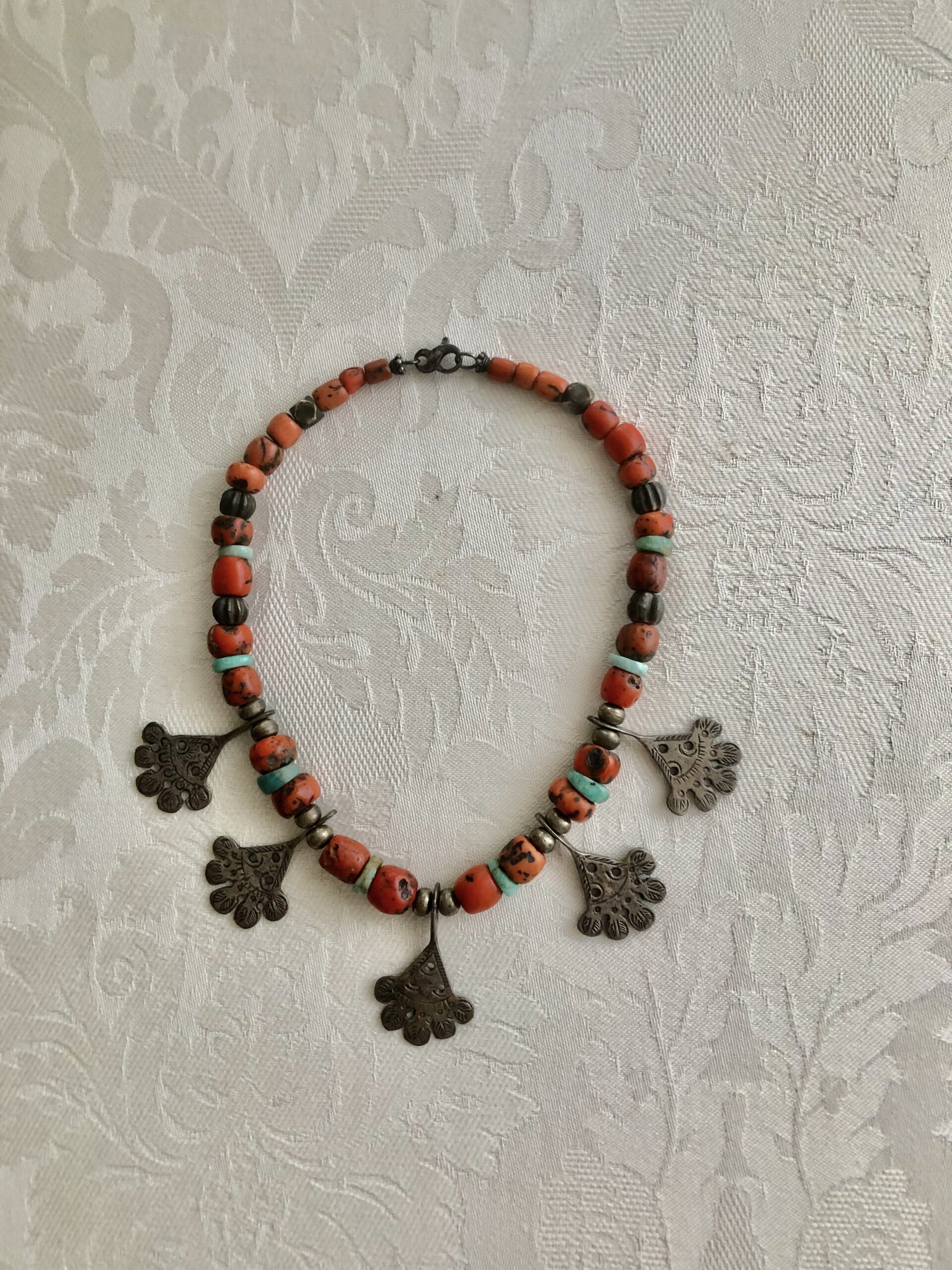 I see necklaces so voluminous, that I wonder whether that’s what they truly are. ‘Berber heirlooms,’ Majid says. They are strung with uneven, round chunks of pink coral, red carnelian, green amazonite, buttery amber, ebony beads, and silver talismans. I see earrings so large that they are fitted with chains going over the head to lessen the weight on the ear lobe. No wonder these jewels were reserved for ceremonies. I point to intriguing pieces in a repetitive triangular shape. They are fibulas—joining the two sides of an overcoat—and converted into pendants unless designers turn them into wall art, in a box frame.