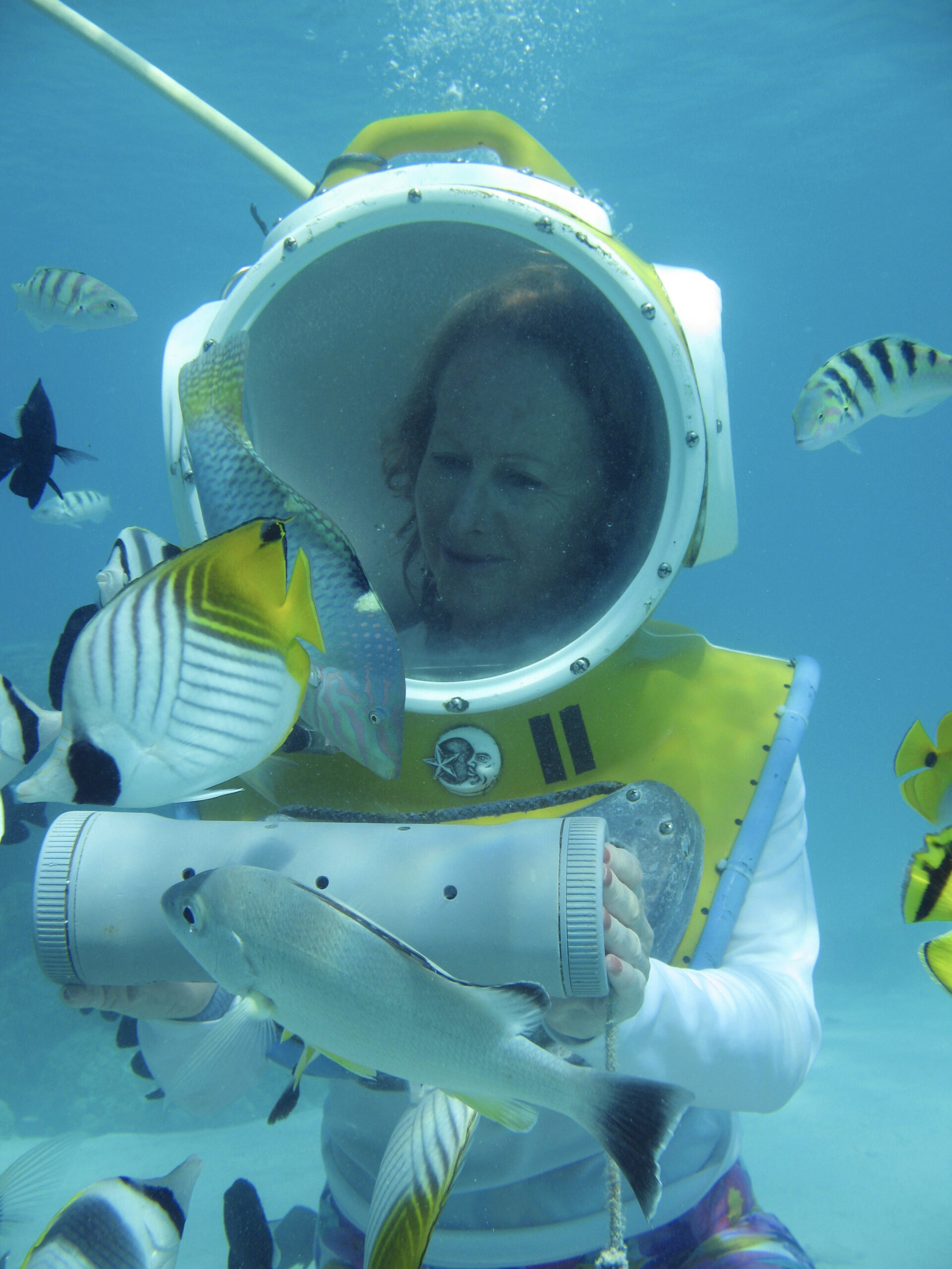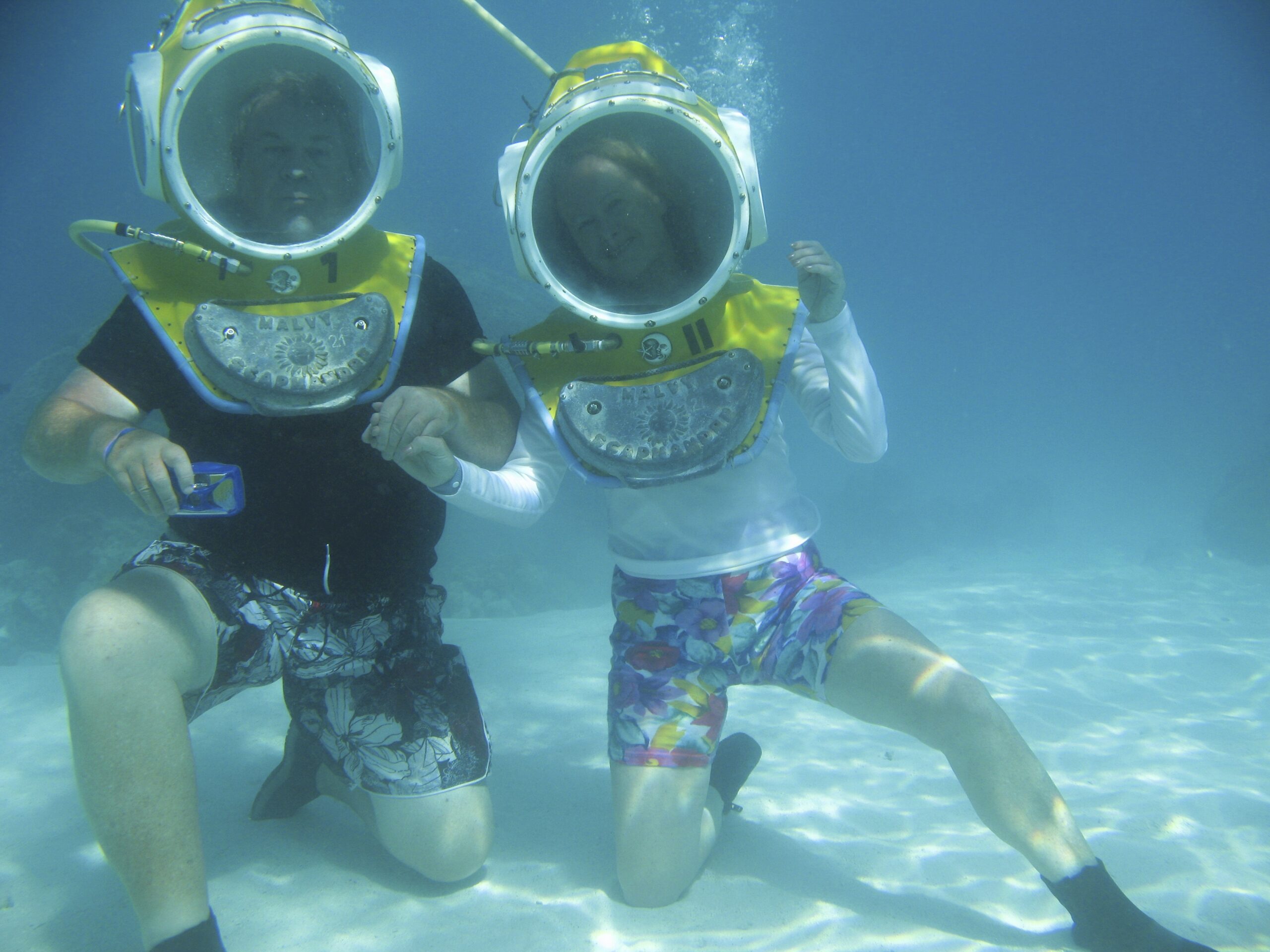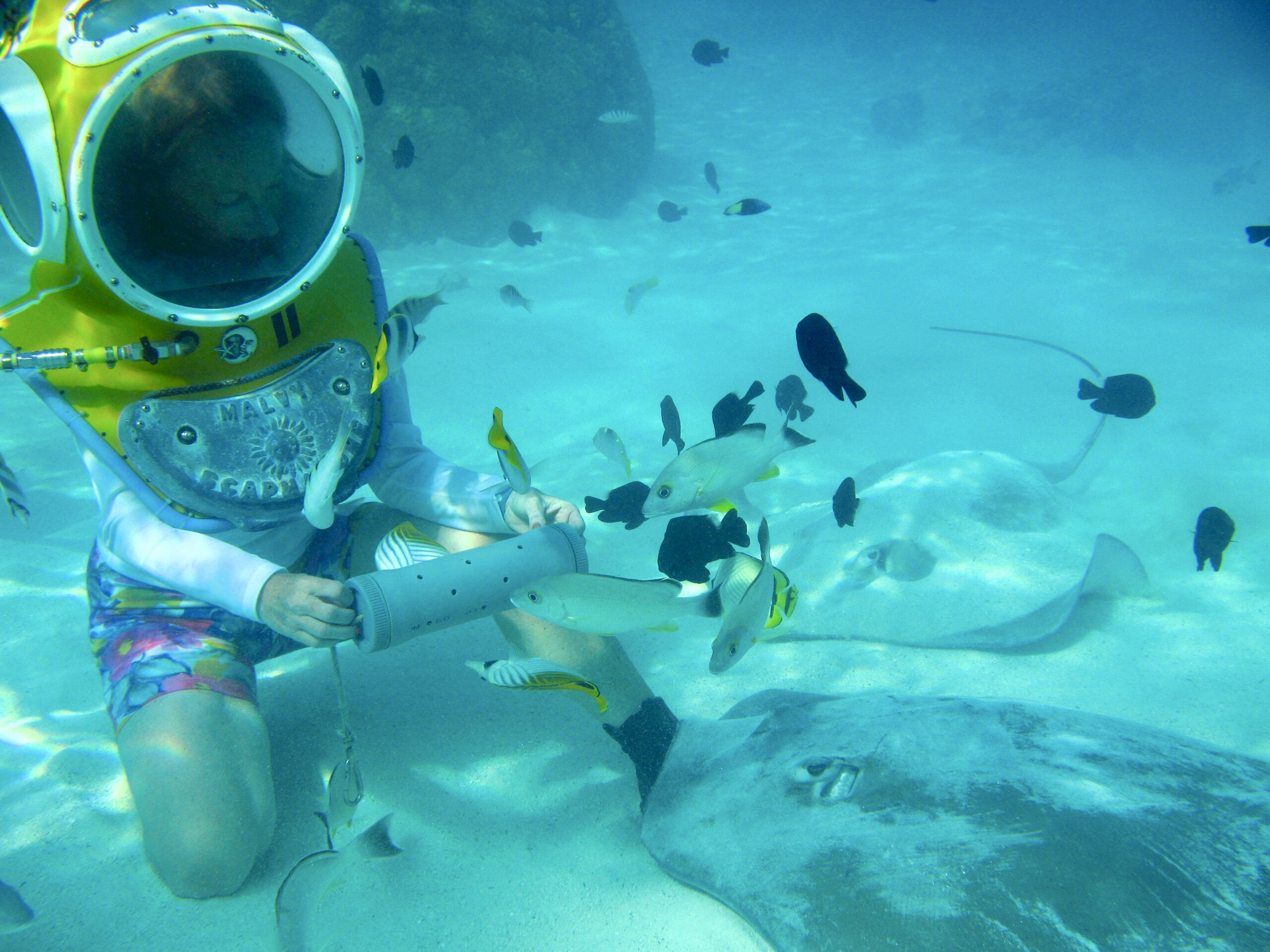 “It will be weightless underwater,” I am told as I stare at the eighty-pound helmet that will encapsulate my head. On my mind is that a stingray accidentally killed the Australian diver and conservationist Steve Irwin, not that long ago. Our guide tries to reassure us about this shark-related fish, “If a stingray comes near you, it’s because it wants to, don’t scare it!” There is no time to mull over this, I am first in line for my maiden helmet dive.