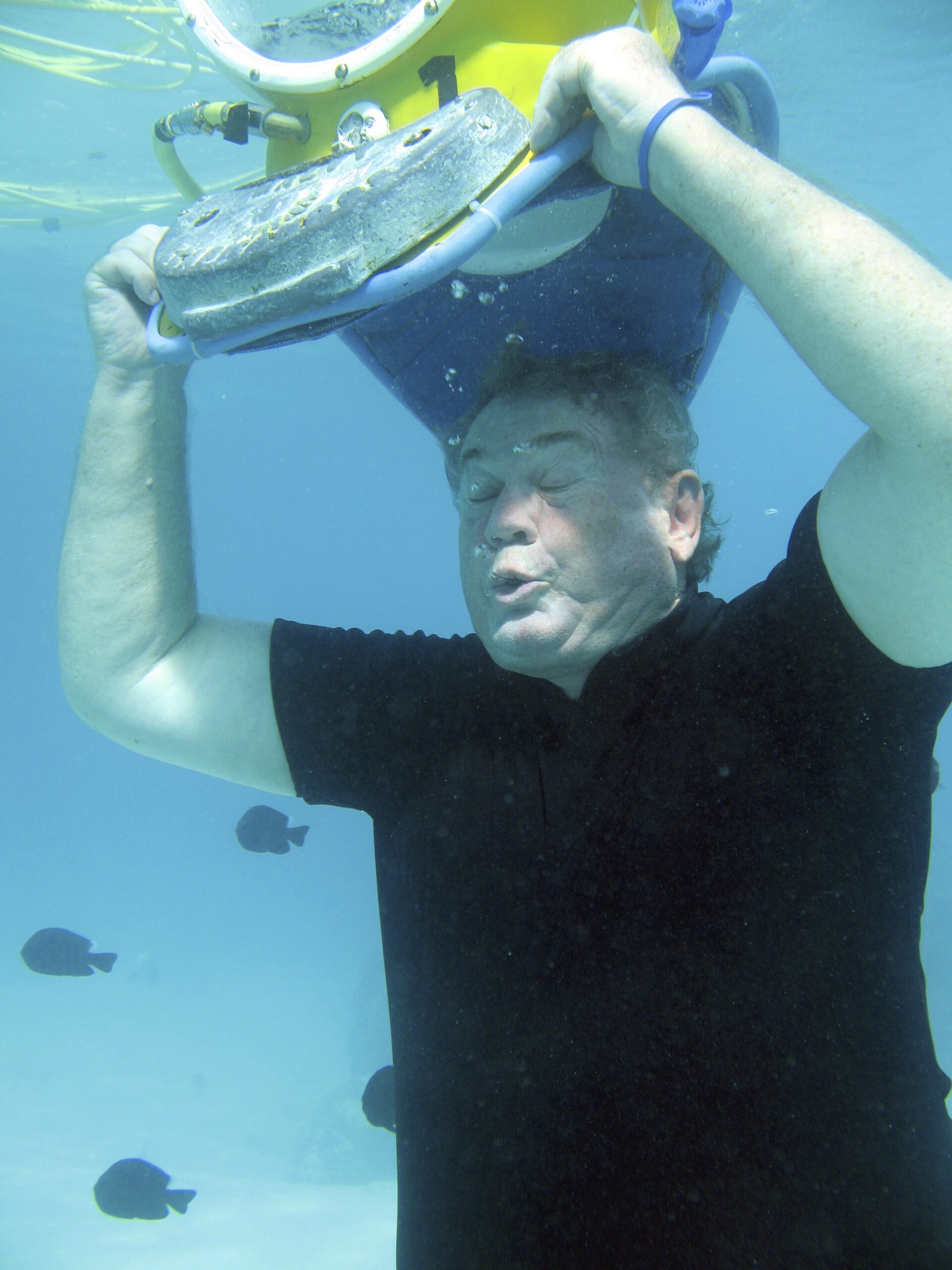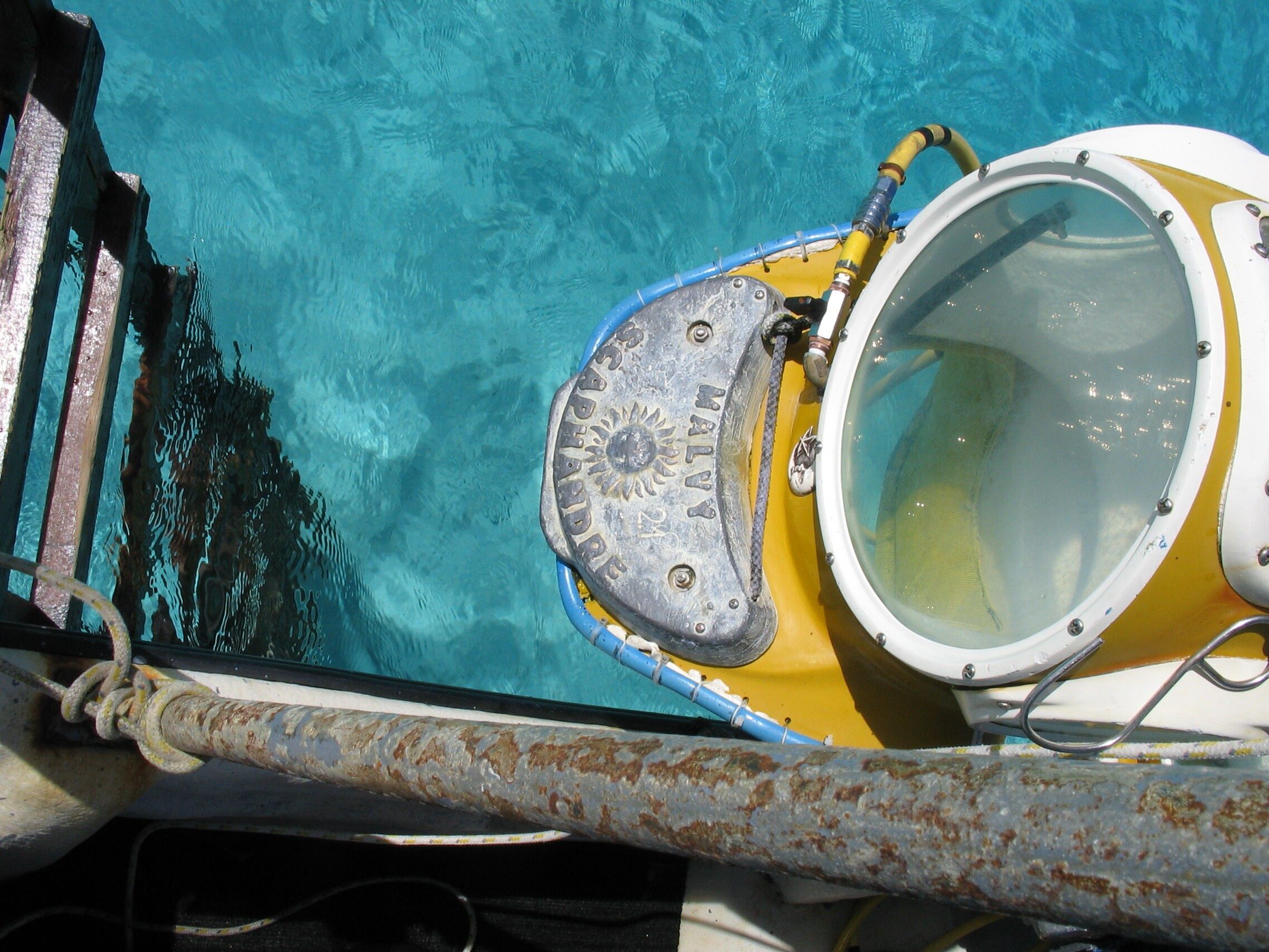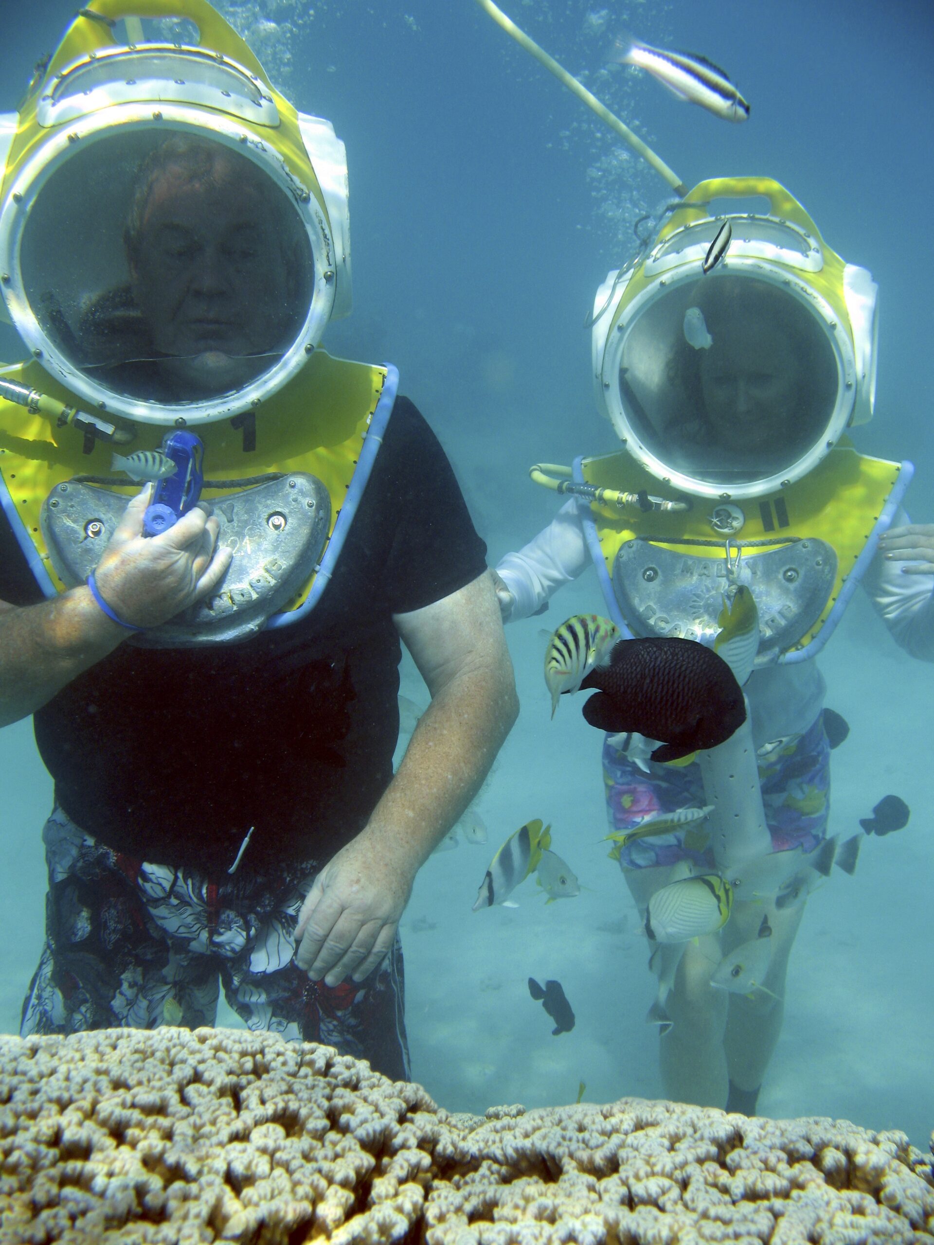 I step down the ladder affixed to the side of the pontoon until I am chest-deep in the water, then Vincent gently places the helmet onto my shoulders. He assists my 16-foot descent, while I cringe at the thought that water might somehow seep under the helmet. I remember my attempt at clearing my mask during my one-and-only scuba diving initiation. I tend to be claustrophobic in some situations.