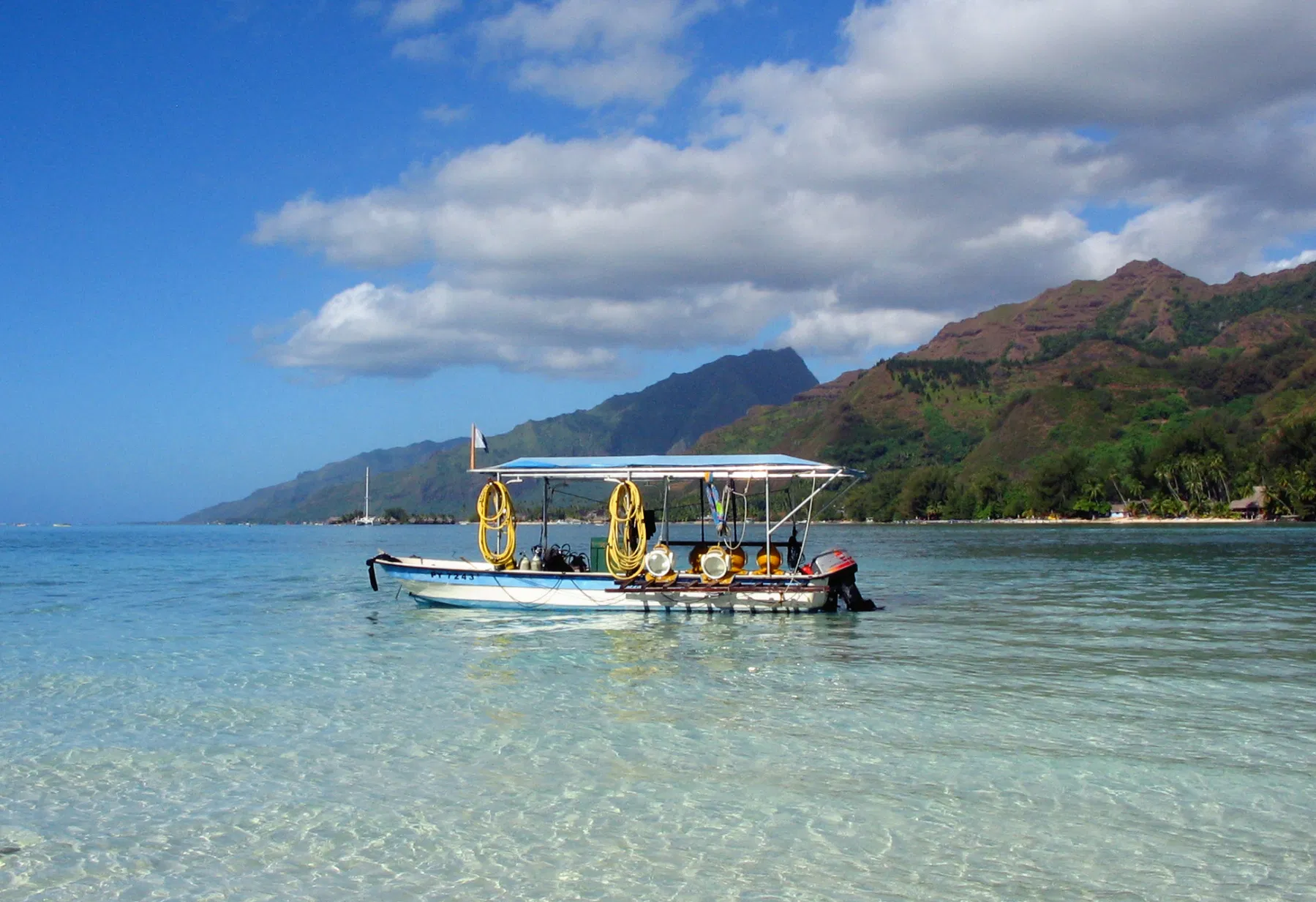 Six of us transfer by van to the Intercontinental Moorea Resort & Spa where we meet the Aquablue Helmet Dive crew. During the ten-minute boat ride to the diving spot on the lagoon, owner-guide Vincent briefs us on safety, assisted by Jeff, a professional cameraman-diver.